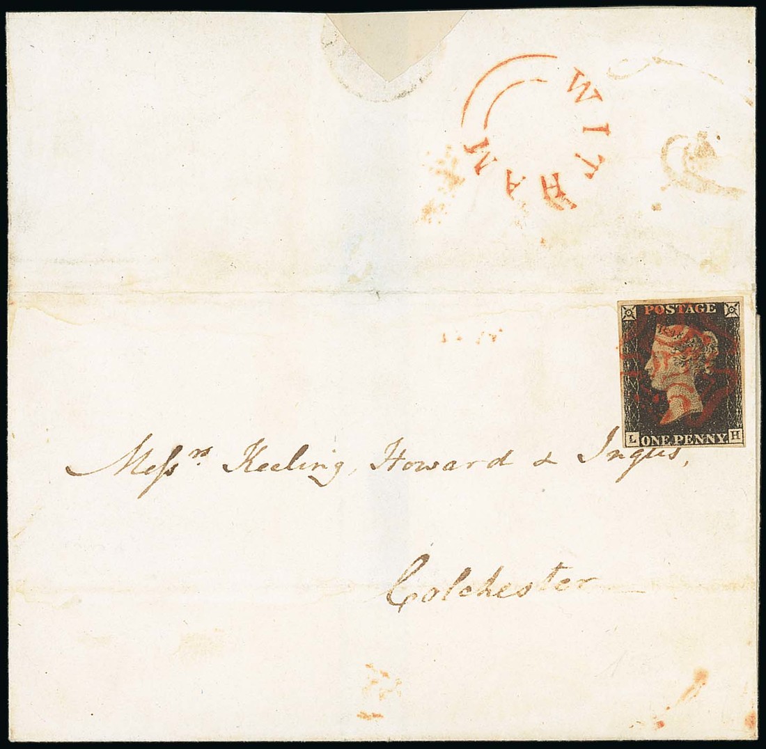 LH close to large margins all round, red Maltese Cross cancellation, on entire to Colchester, dated 4 Oct. 1840, red Witham undated circular marking on reverse; filing folds well clear of the adhesive, scarce and attractive. Photo