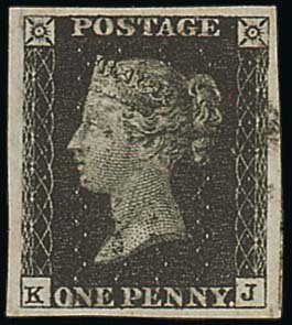 KJ a delicate impression with large to very large margins all round and showing a portion of the adjoining stamp at right, light black Maltese Cross cancellation. A fine example from this scarce Plate. Photo