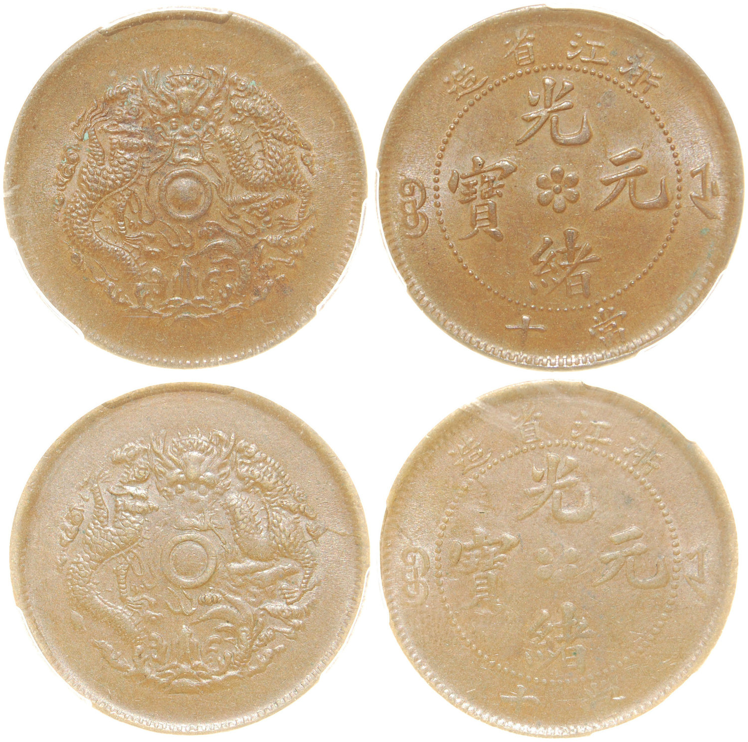 China, Chekiang Province, lot of 2 copper 10 cash, 1903-06, (both Y-49.1), PCGS AU 58 and MS63BN (2)