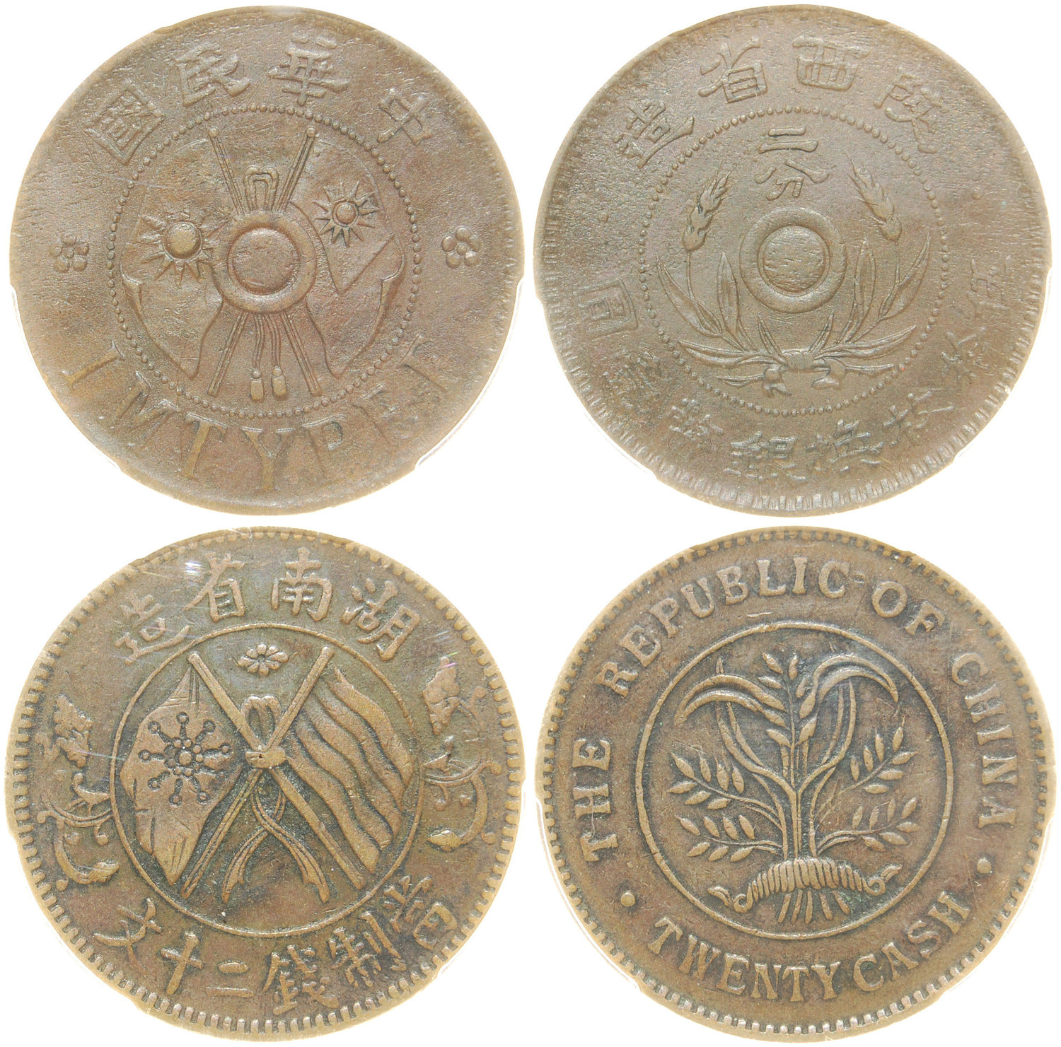 China, Republican era, lot of 2 coppers coins, Hunan Province, 20 cash, 1919 and Shensi Province 2 fen, 1928,