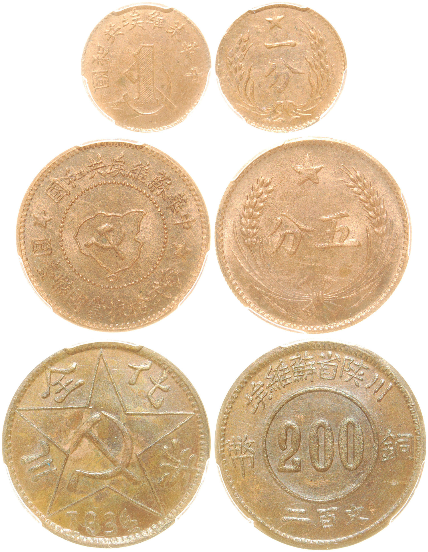 China, Soviet areas, lot of 3 copper fractionals, all are restrikes from c.1960, Chinese Soviet Republic, 1 cent, Szechuan-Shensi Soviet, 5 cents and 200 cash,