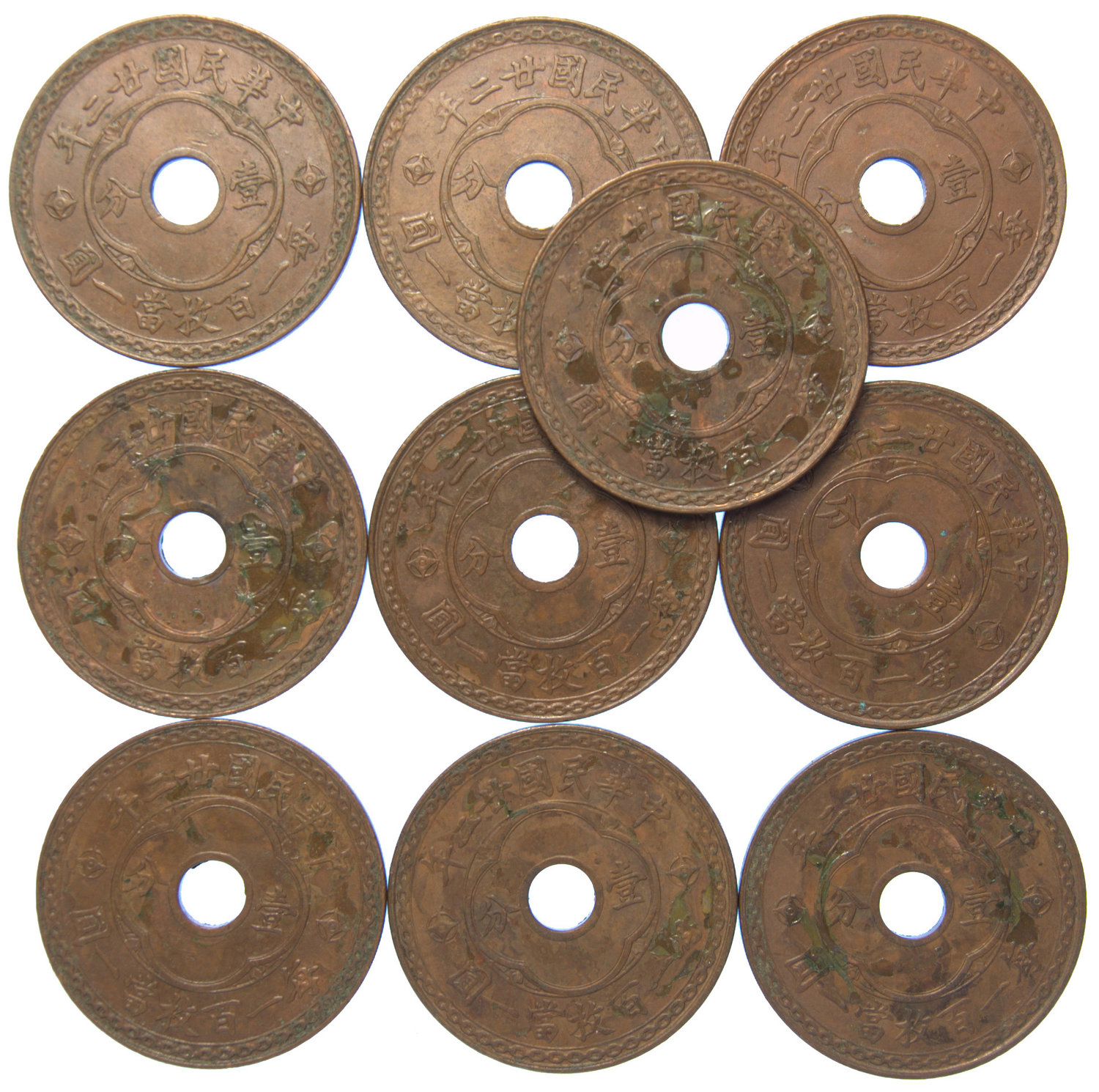 China, Republican,a lot of 10 x bronze 1 fen, 1933,wreath at left and right on obverse, value and year in Chinese on reverse,