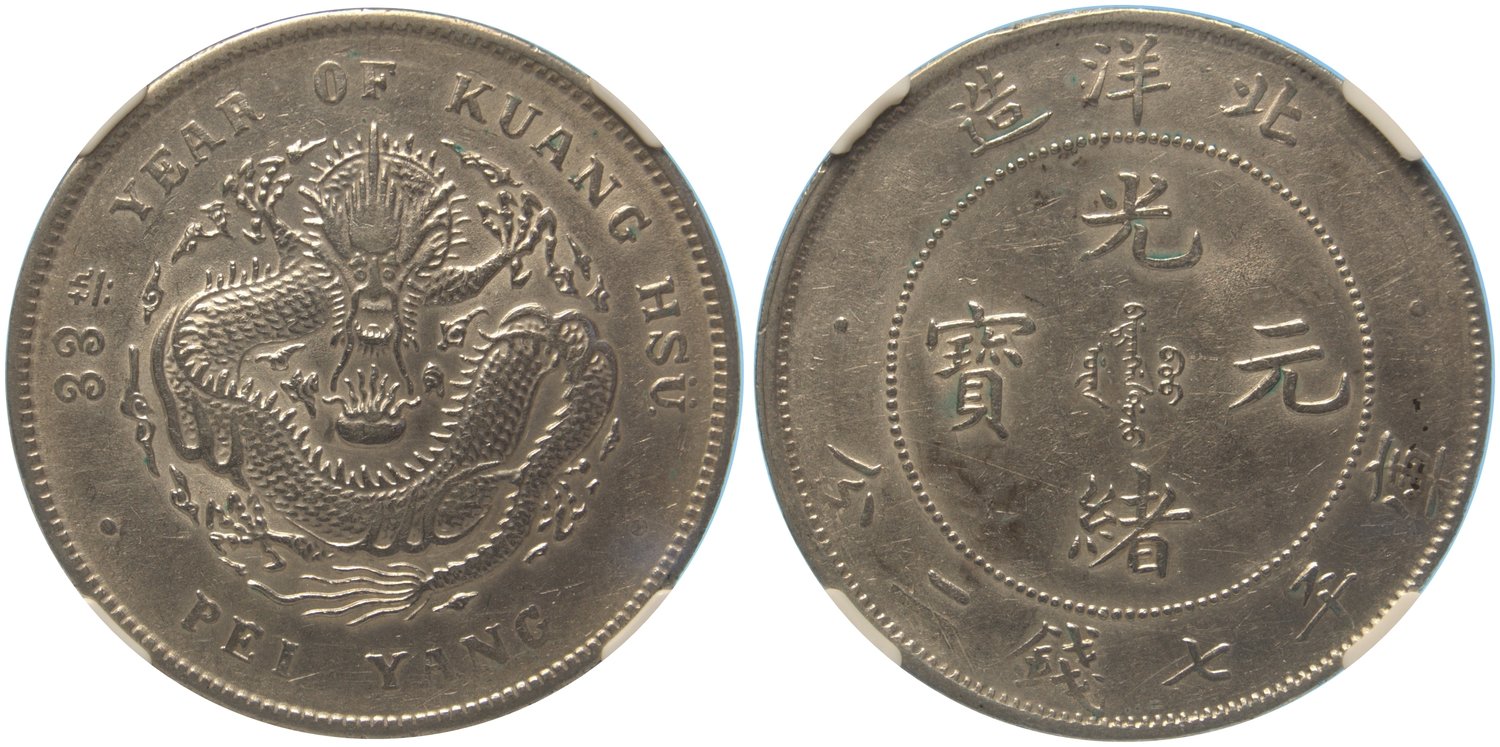 Chihli Province, silver dragon dollar, 1907, NGC AU55.