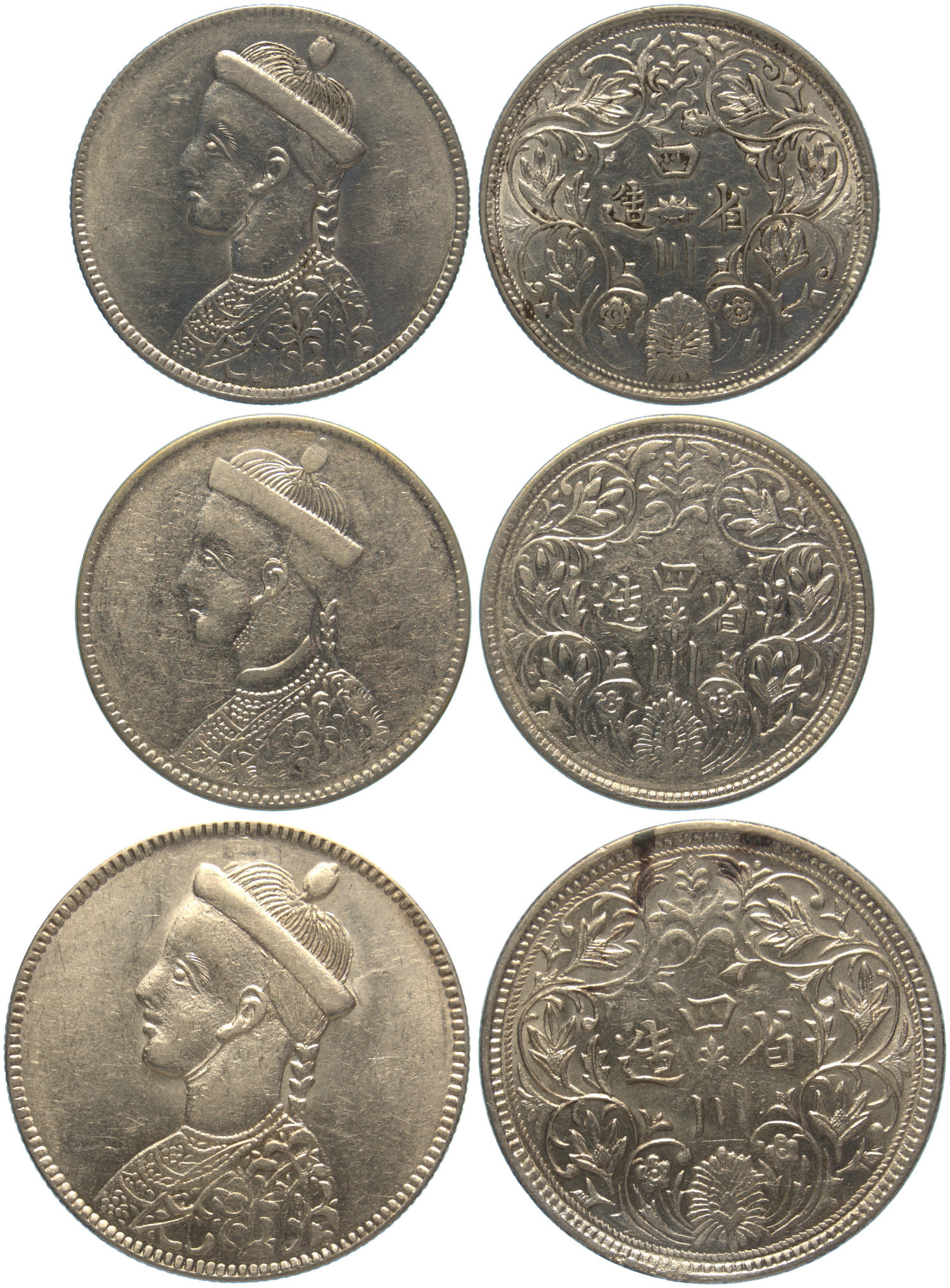 China, issued for Tibet,lot of 3 x silver rupees, ND( 1903-1942),one with collar and vertical rosette, two without collar, vertical and horizontal rosette respectively,