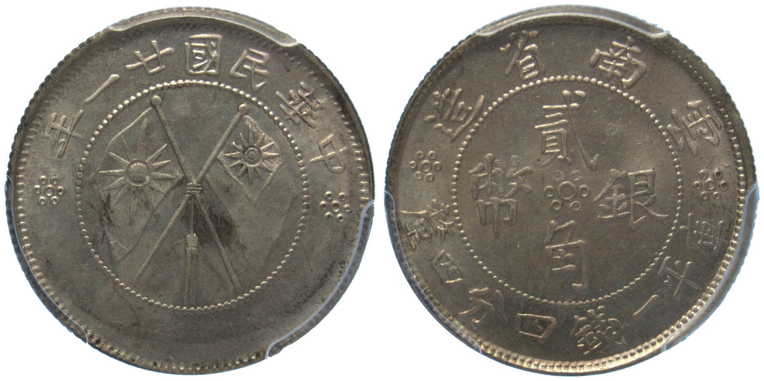 China, Yunan Province,Silver 20 cents, 1932,crossed flags on obverse, value and place name in Chinese on reverse,