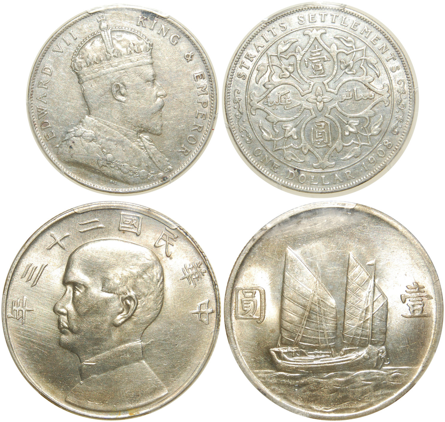 Straits Settlements, silver $1, 1908, also China, republican era, silver Junk dollar, 1934,