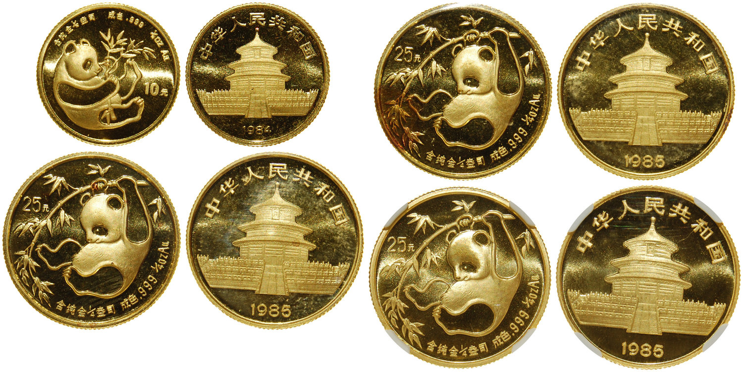 Gold Panda, 1/10, 1/4, 1/4, 1/4, 1/4oz gold, the first 3 coins unslabbed, (two with toning) and the last NGC MS69 respectively. (4)