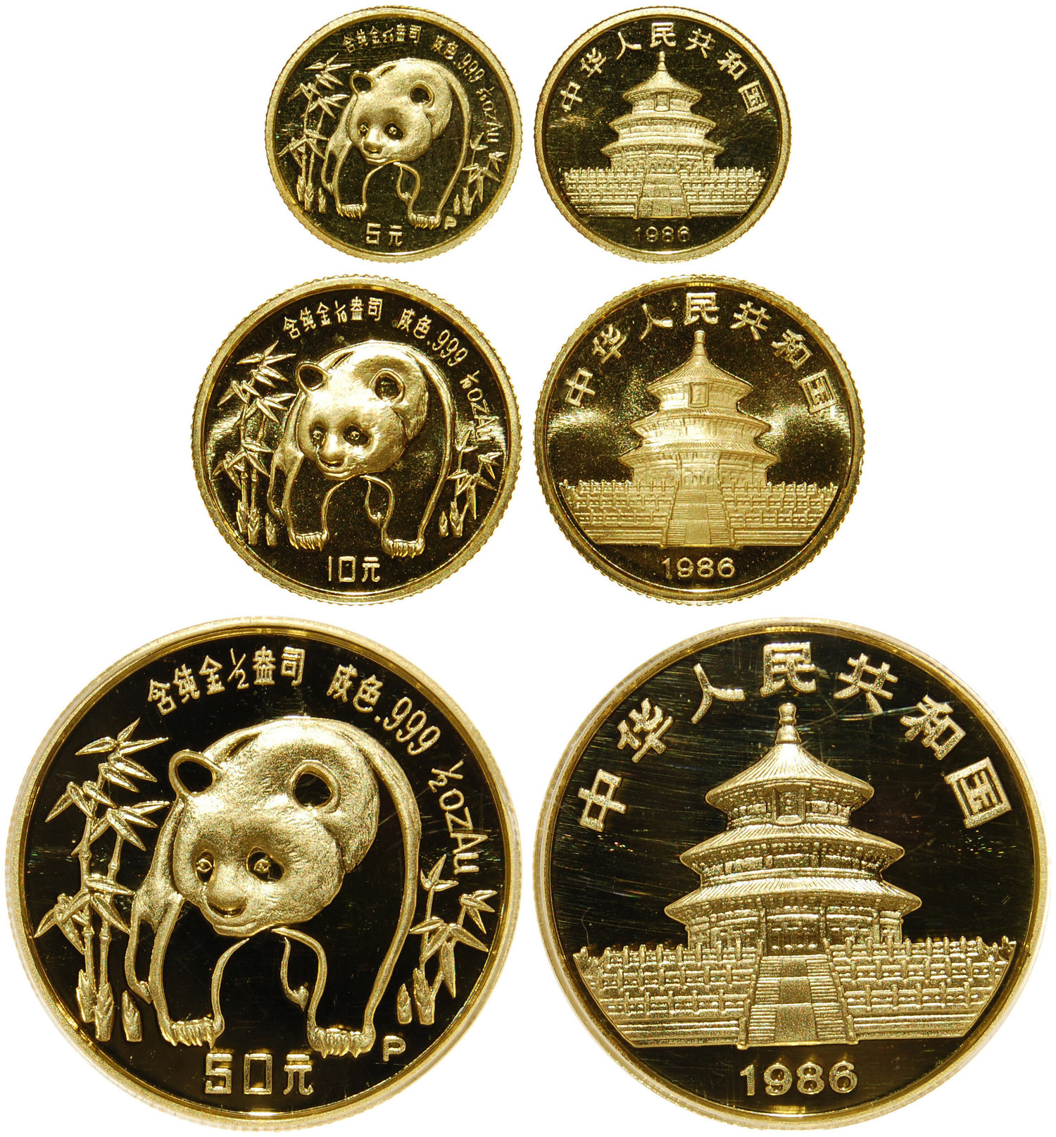 Gold Panda, 1/20, 1/10, 1/2oz gold, the first two coin un slabbed and the 50 yuan PCGS PR69 DCAM (3)