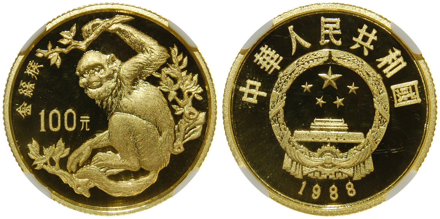 China, People's Republic, 100yuan, 1988(Proof), Gold ‘Monkey’ (series I)