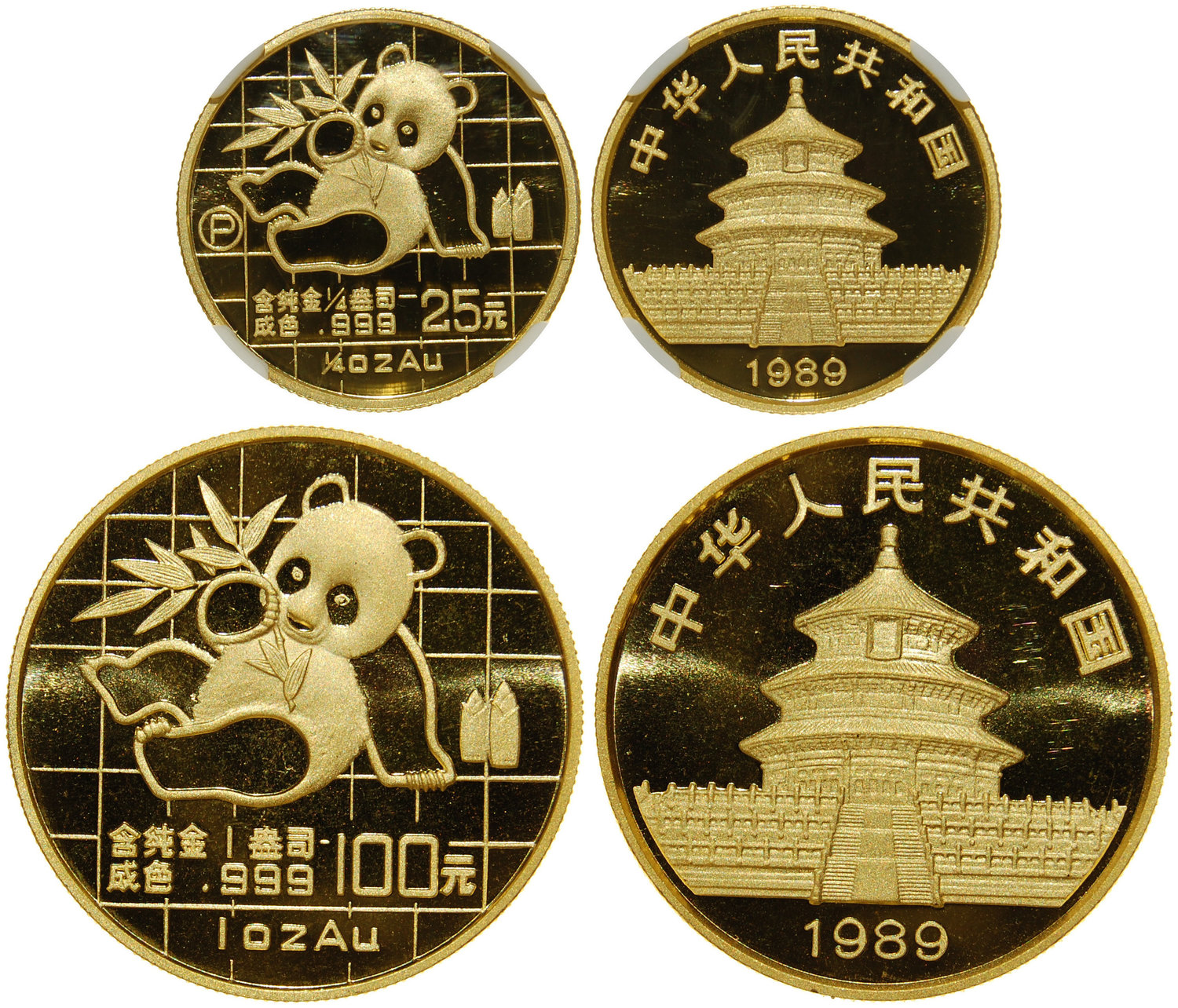 China, People's Republic, lot of 2 coins, 25 yuan and 100 yuan, both dated 1989