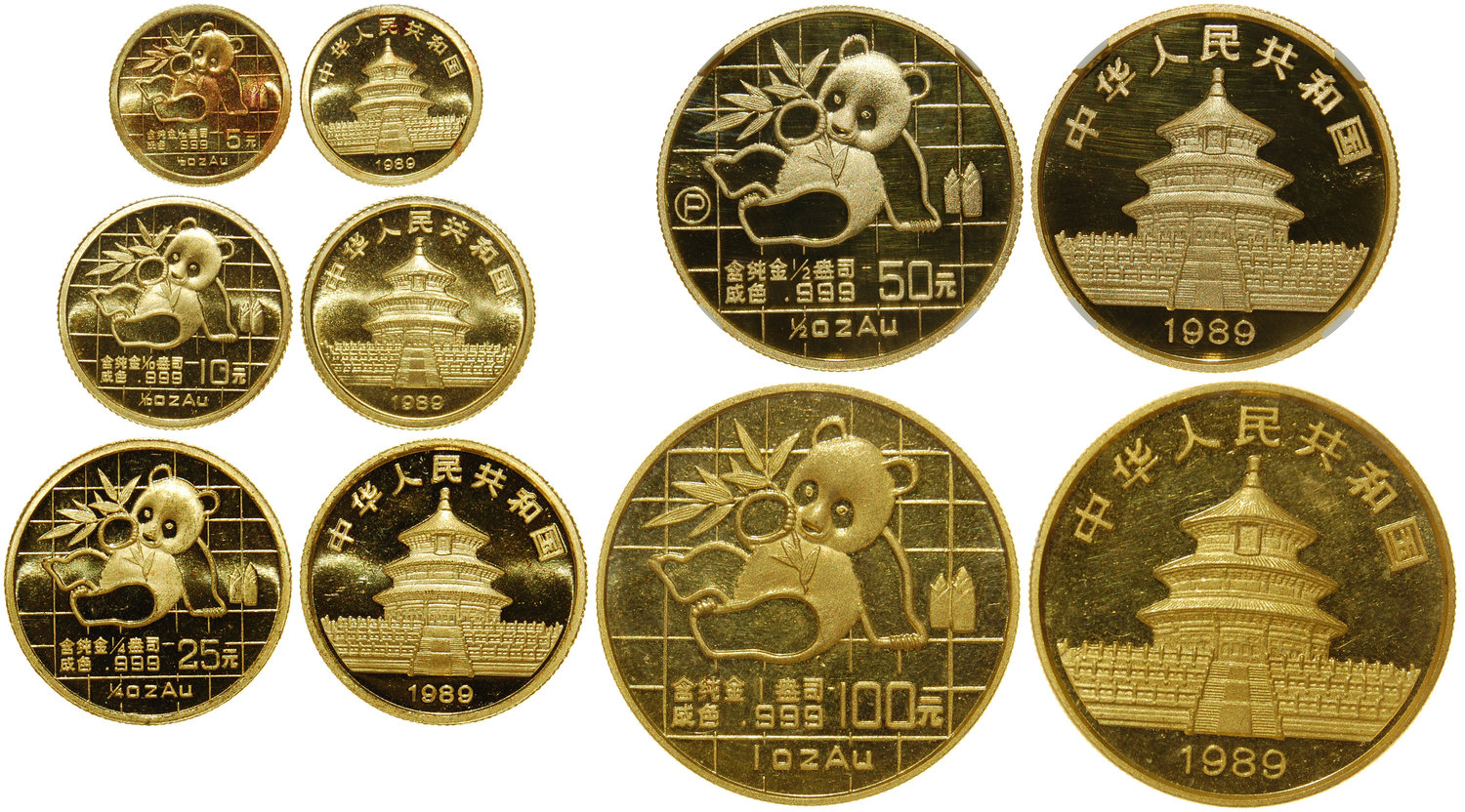 China, People's Republic, complete set of 5 gold pandas dated 1989. 5, 10, 25, 50 and 100 yuan,