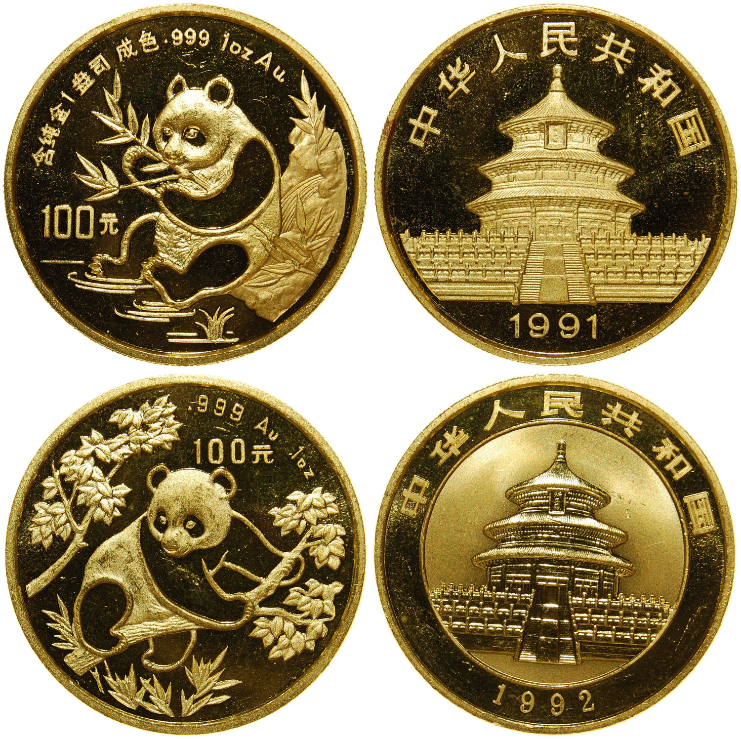 China, People's Republic, lot of 2 gold 1oz pandas, 1991 and1992,