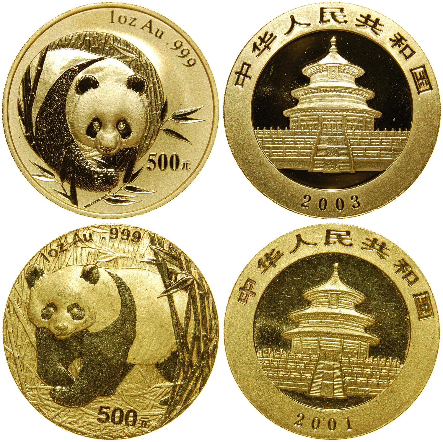 China, People's Republic, lot of 2 gold 1oz pandas, 2001 and 2003