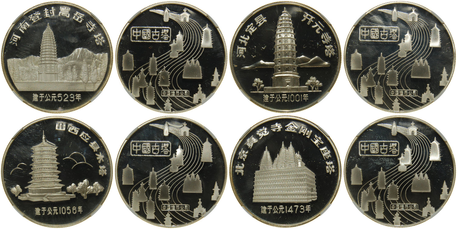 China, People's Republic, lot of 4 silver medals, 1984, Famous Pagodas in China: ‘Yingxian Wooden Temple’, ‘Songyue Temple’, ‘Zhenjue Template’, ‘Kaiyuan Temple’,