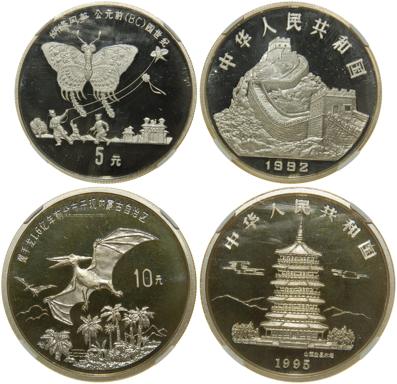 China, People's Republic, lot of 2 coins, 10, 10yuan, 1992(Proof), 1995(Proof), Silver ‘Ancient Kite’, Silver ‘Pterosaurs’,