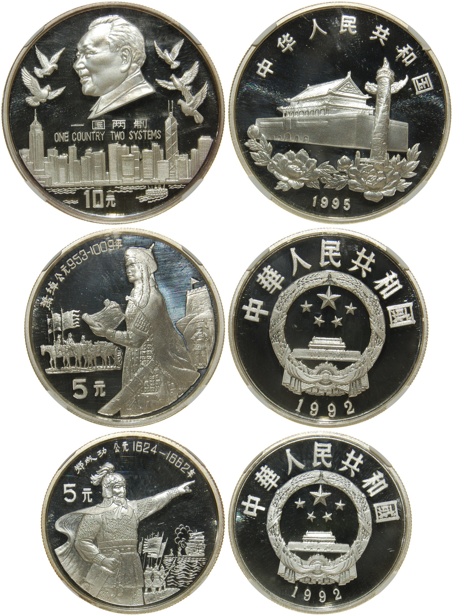 China, People's Republic, lot of 3 coins, 2x 5 yuan (1992) and 1x yuan (1995), Silver Xiao Chuo figure (Historical Figures Series IX), Silver Zheng Chenggong figure and Silve One Country Two Systems (series I),