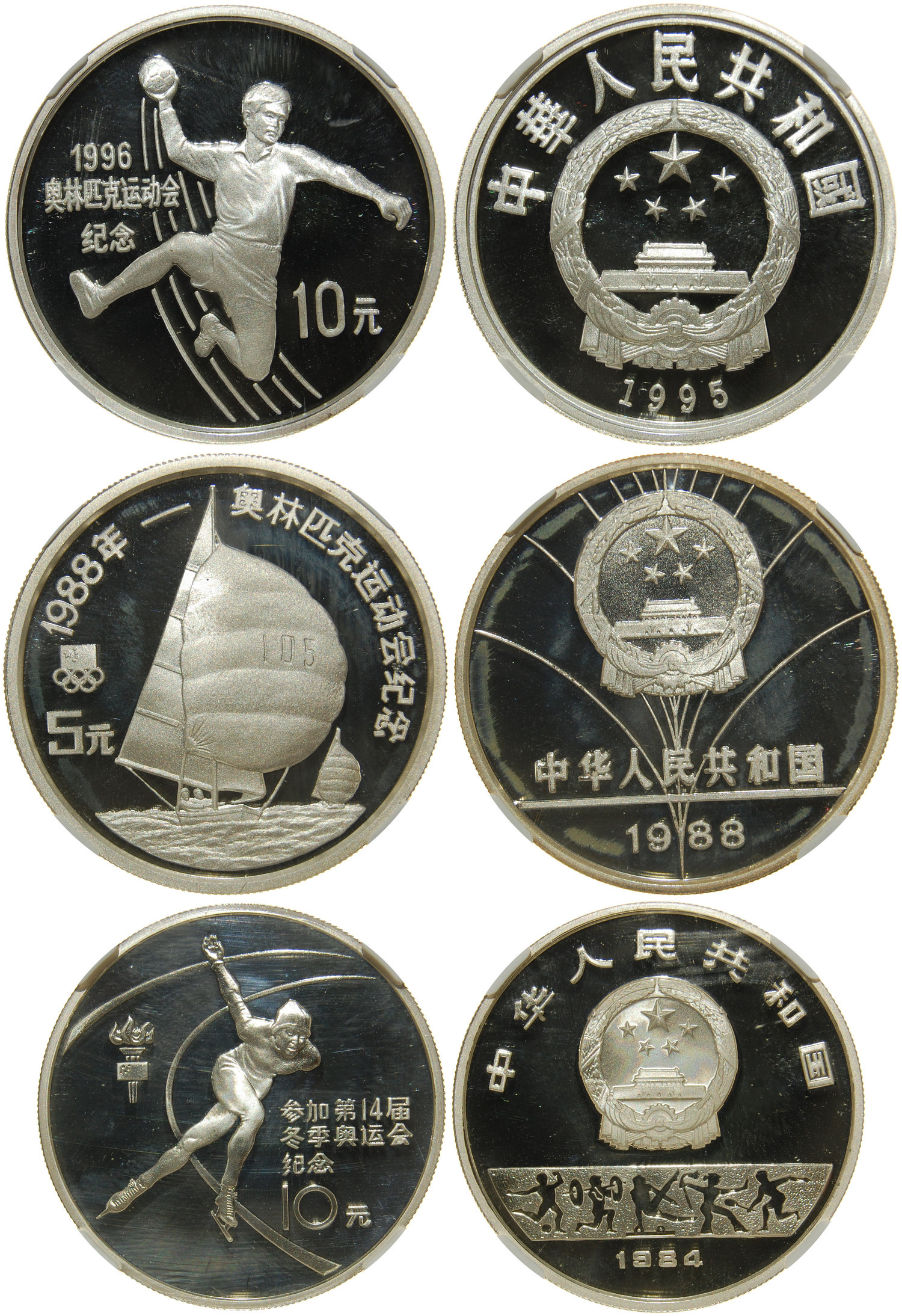 China, People's Republic, lot of 3 coins, 5, 10, 10yuan, 1984(Proof), 1988(Proof), 1995(Proof), Silver, Olympics – ‘Speed Skating’, ‘Sailing’ and ‘Handball’,