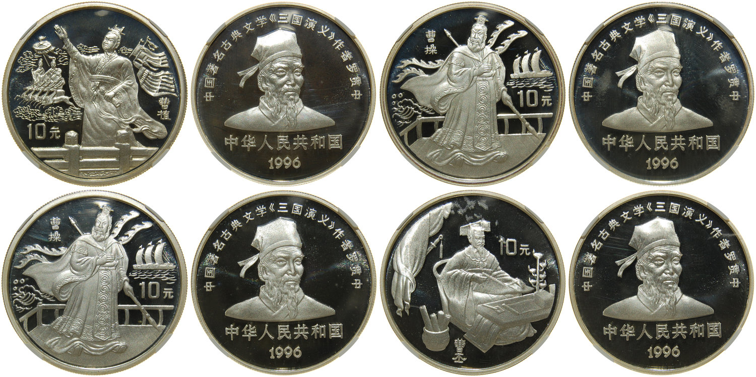 China, People's Republic, lot of 4x silver 5 yuan coins, 1996, Roamnce of the Three Kingdoms: ‘Cao Cao’ (2), ‘Cao Zhi’, ‘Cao Pi’,