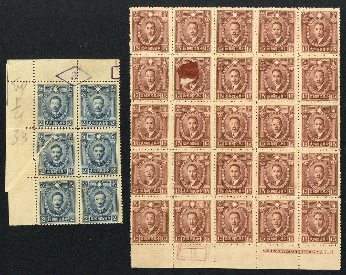 1940-41 Hong Kong Martyrs varieties with 2c. blue in a corner block of six showing a diagonal paper fold variety, and 15c. maroon in a lower margin block of tewnty five, one stamp with large ink mark in the centre of the stamp. Unused
