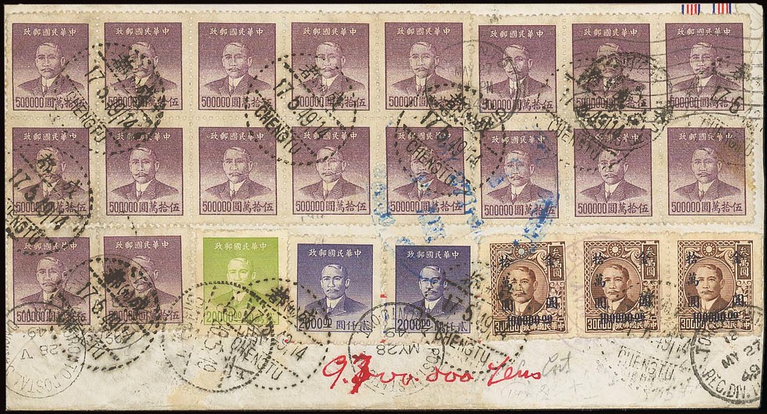 1949 (17 May) opened-out air mail envelope registered to Canada bearing, on the reverse, 1949 Sun Yat Sen $2000 (2), $20,000 and $500,000 (18) plus $100,000 on $30,000 (3) tied by Chengtu c.d.s. with Shanghai and Toronto c.d.s. A stunning $9,324,000 franking used during the Silver Yuan period. Photo