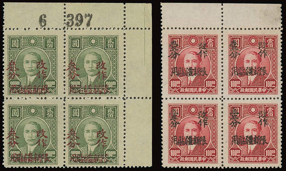 1942 Silver Yuan 1c. on $100 to $1 on $6000 set of six in blocks of four, with margin or corner margins, unused without gum as issued. Fine. Chan S107-112; S.G. 261-266, £3000. Photo