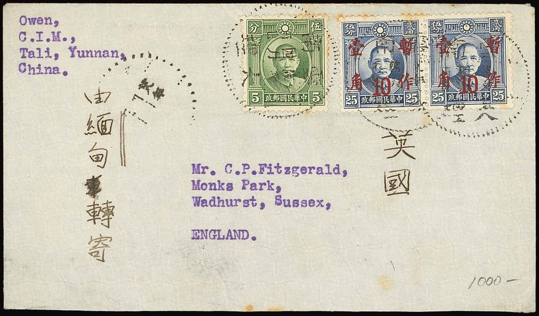 1939 (5 Apr.) envelope to England bearing 25c. franking tied by large dotted Tali datestamp and bearing, on the reverse, two strikes of Tengyuen c.d.s. (13.4); fine. Photo