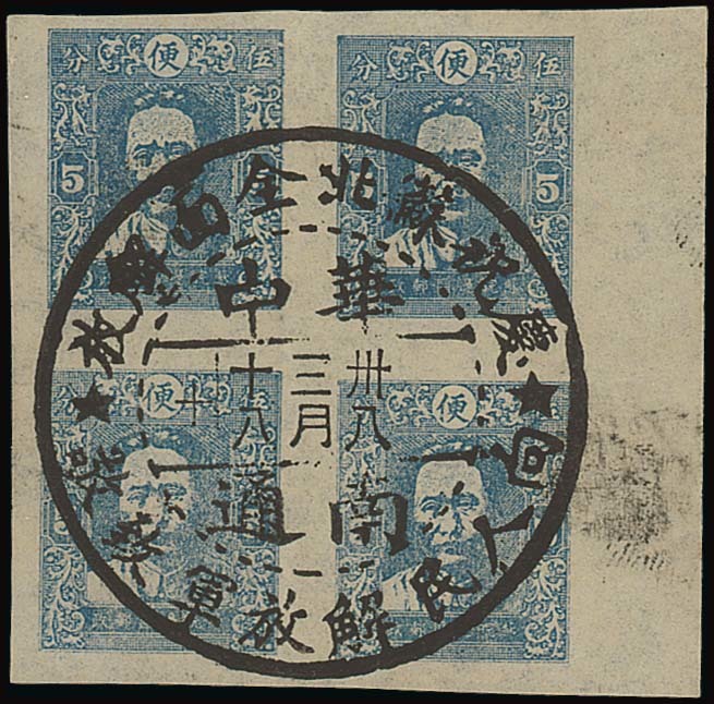1946 Chairman Mao imperforate 5c. blue in a right margin block of four cancelled by a fine and central strike of a large commemorative c.d.s. Fine. Photo