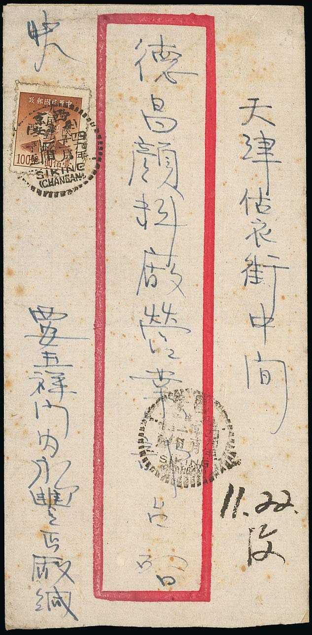 —1949 (1 Nov.) envelope to Tientsin bearing $100 chestnut tied by Siking dotted datestamp, a second strike alongside and faint arrival on the reverse; good. Yang NW45; S.G. NW52. Photo