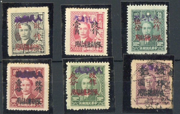 1949 straight-line handstamp on Dah Tung and Plum Blossom set of six, $1 on $6000 is used with central Hami c.d.s., the others are unused without gum as issued. Yang NW85-90; S.G. NW83-88, £310