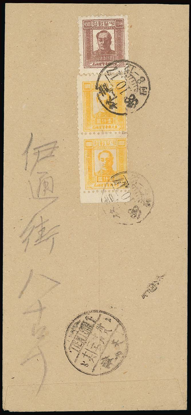 1948 Chairman Mao, Fourth Print; 1949 (17 Oct.) envelope double registered to Tientsin bearing, on the reverse, $1000 yellow on white paper, a vertical pair with lower margin with fifth print $4500 tied by Jilin c.d.s., the address side with the registration handstamps and the arrival c.d.s. Clean and fine. Photo