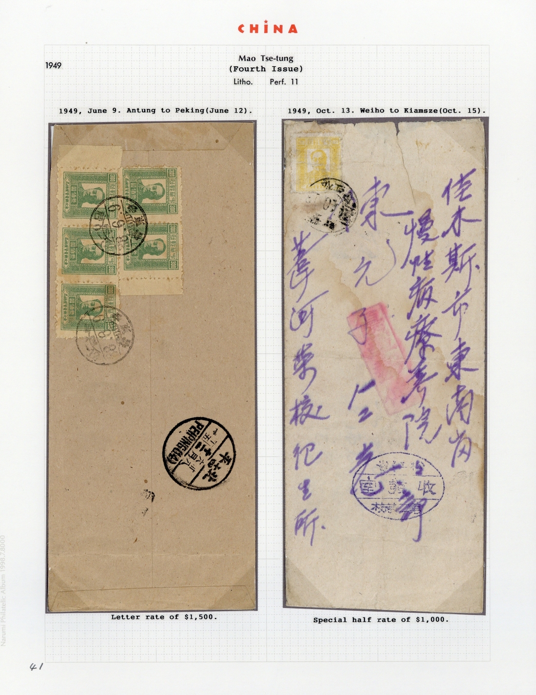 — 1949 covers with (9 June) cover to Peking bearing $300 (5) tied by Antung c.d.s.; (13 Oct.) envelope to Kiamsze bearing $1000 tied by Weiho c.d.s. and paying the special half rate, soiled. A good pair of covers. (2 covers)