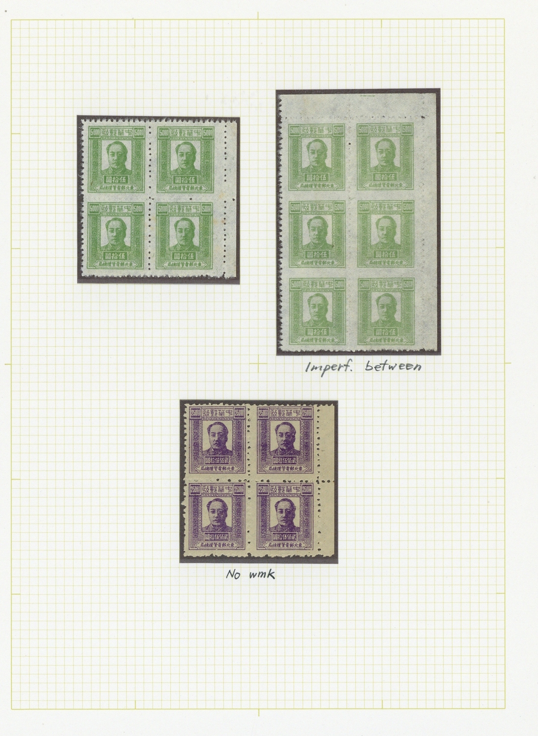 A general collection on leaves which includes 1946 Mao First print set of four with $1 proof in slate-purple, first Surcharge set of eight, second surcharges including both $5 on $1 surcharge inverted in horizontal pairs, 1947 second Mao set to two shades of $500, used values to $500 (3) and $20 offset; third Mao issue including $50 green variety imperforate between vertical strip of three (2), third surcharges with better values and varieties including "300" missing on $90 blue; Mao fourth print with colour and paper varieties including imperforate; fifth print; fourth and fifth surcharge including surcharge inverted and other varieties; sixth surcharge with six values in singles and imprint corner blocks of four, 1950 envelope registered to Hong Kong. Also some commemorative or pictorial issues including 1949 factory in a corner block of twenty five, $5000 surcharge including varieties double and inverted plus a pair used on cover to Hong Kong; Production in Field and Industry including $10,000 imperf. pair plus a single used on cover from Harbin to Moscow and $5000 pair on cover from Andong to Moscow. A very good lot