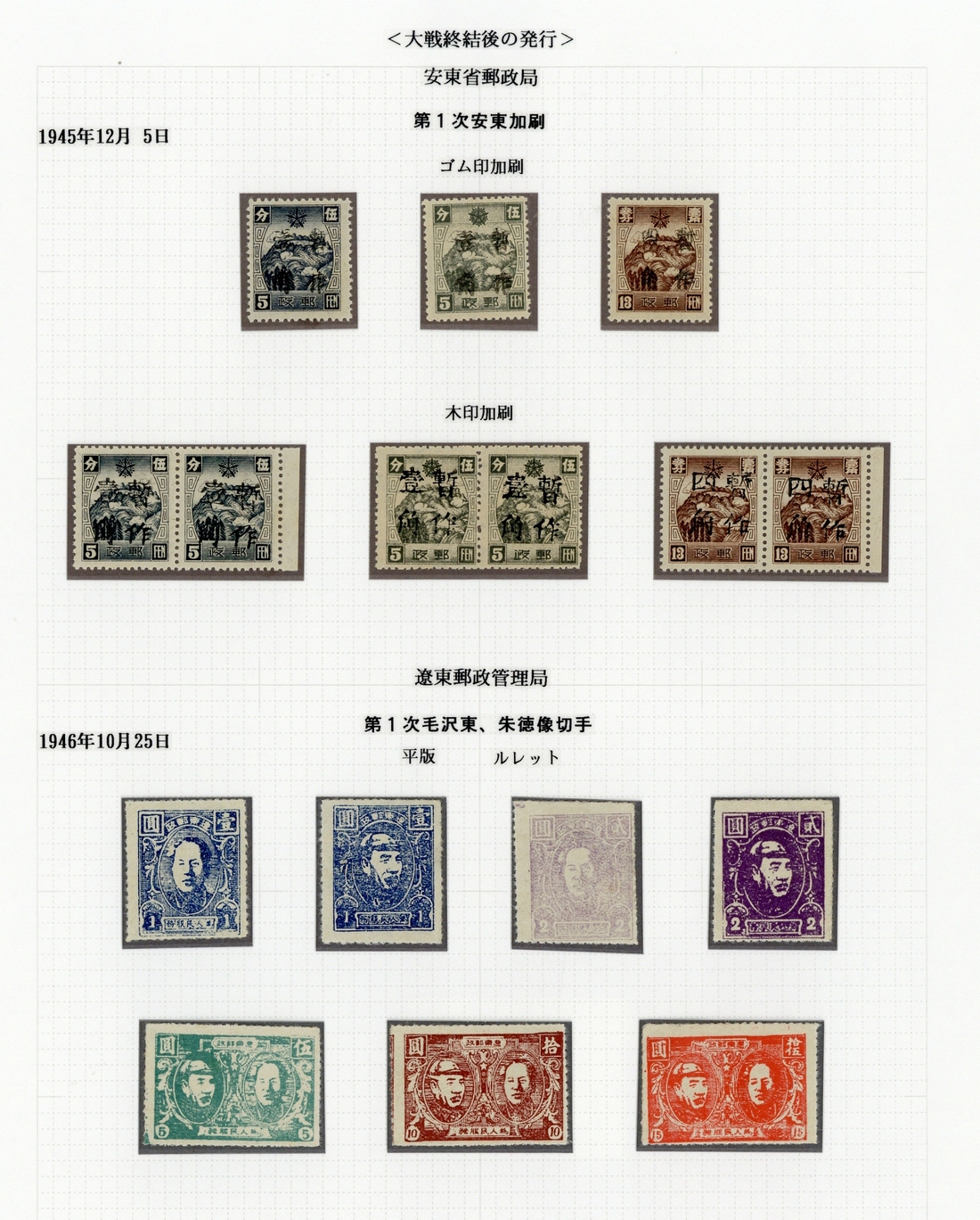 An unused collection on leaves with 1945 first surcharge, small characters set of three and large characters set of three in pairs, 1946 Chu Teh and Chairman Mao set of seven, 1947 second surcharge with both $5 and $10 on 5f., second issue $10 on calendar paper (3) and on newsprint (5), a good selection of 1947 fourth hand surcharge on $10 including $100 surcharge inverted. An attractive collection. (41)