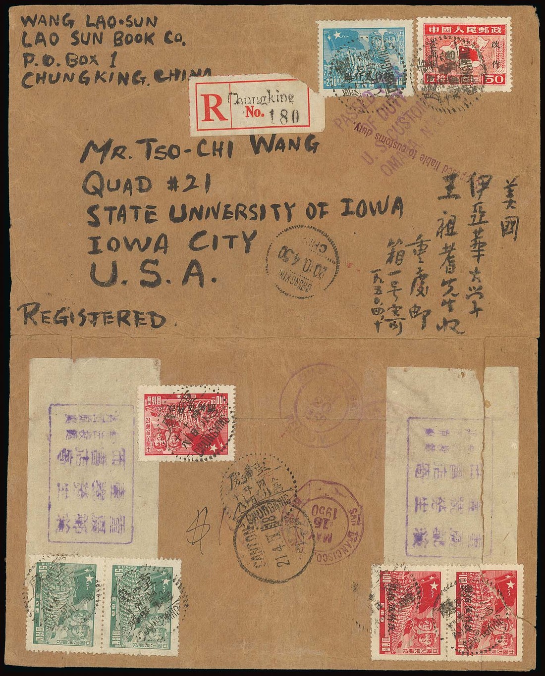 East Szechwan: 1950 (10 Apr.) opened-out envelope registered to Iowa, U.S.A. bearing Marching Soldiers $50 (2) and $200 with $10,000 on $50 (torn) and East Szechwan $500 on $100 (3) tied by Chungking despatch c.d.s., with Canton, San Francisco and Omaha transit c.d.s. A few imperfections, nevertheless and fine and interesting franking. Photo