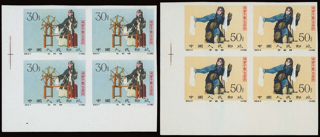 1962 Mei Lan Fang (C94) 4f. to 50f. imperforate set of eight, in corner blocks of four; lightly mounted mint; a couple of minor bends. A very good set. Yang C307-314i. Photo
