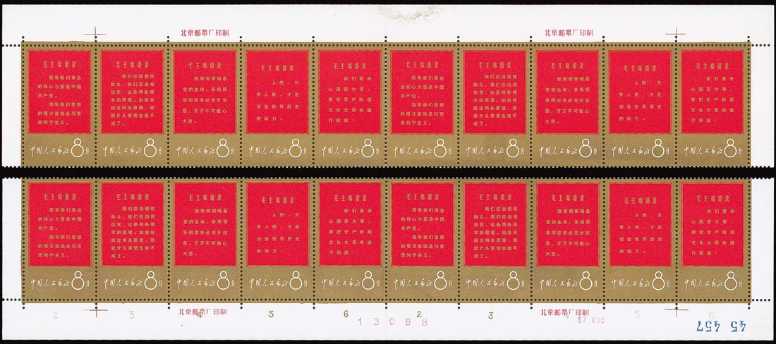 1967 Thoughts of Mao (W1), 8f. red and gold in top and lower margin strips of ten, including the four imprints; lightly mounted in the margins only.. There is a small stain in the top margin of the upper block. Superb gold colour. Fine. Photo
