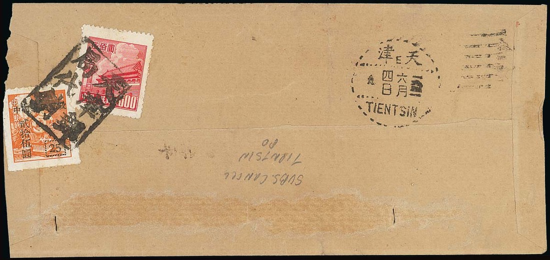 1951 (2 June) buff envelope to Tientsin bearing Tien An Men $500 carmine and 1951 $25 on roulette Unit stamp (only available in N.E. China), one of each on the address side cancelled by the despatch c.d.s., a further example of each on the reverse are cancelled by a heavy strike of the boxed Cancelled in Tientsin with Tientsin arrival c.d.s. alongside; two punch holes at side and the end reduced on opening affecting one of the adhesives on the address side. Unusual. Photo