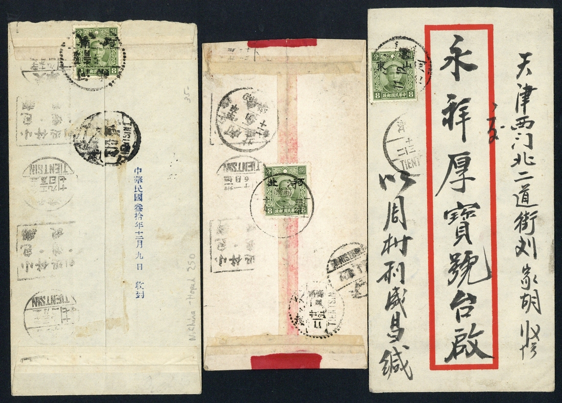 1942 a group of red band covers to Tientsin each bearing, on the reverse, Sun Yat Sen 8c. with overprints for Honan, Hopeh and Shantung appropriately cancelled, one with straight-line censor handstamp. Good to fine. (3 covers)