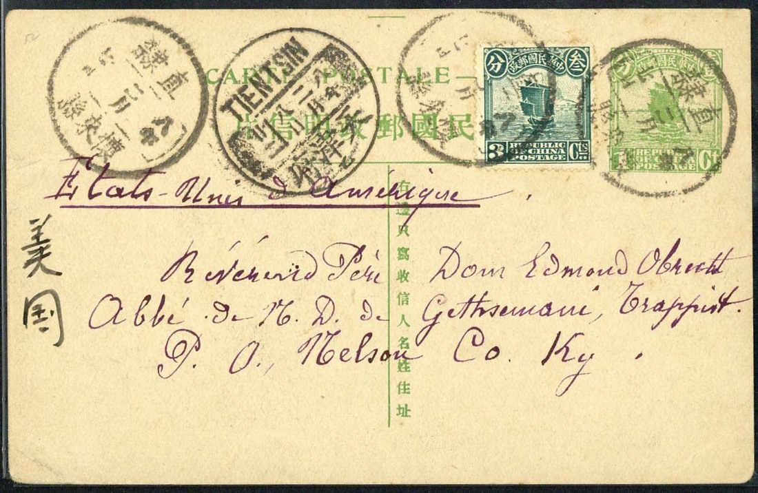 1915 First Print Junk: 1919 (7 Feb.) 1c. yellow-green card to U.S.A., uprated with 3c. Junk, cancelled by Hwailai Hsien, Hopei with a further strike at left and a good strike of Tientsin transit c.d.s. Good. Han 12