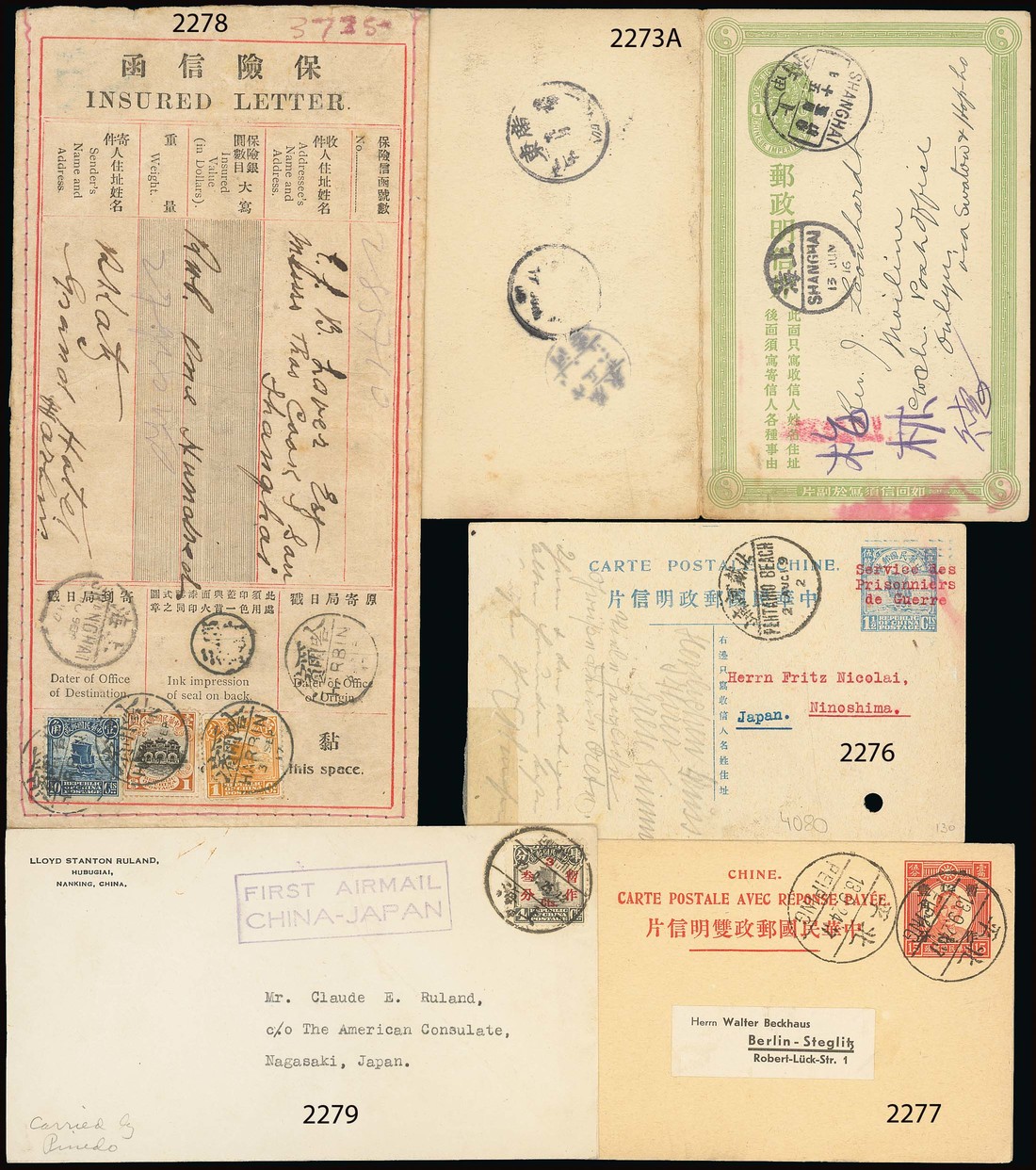 1918 Second Print Junk; 1½c. blue, original plate; used as a prisoner of war card, to Ninoshima, Japan and typed over the stamp "Service des/Prisonnieres/de Guerre" with a good strike of 1919 (21 Aug.) Pehtaiho Beach c.d.s. alongside. There is a single punch hole. Unusual and scarce. Photo
