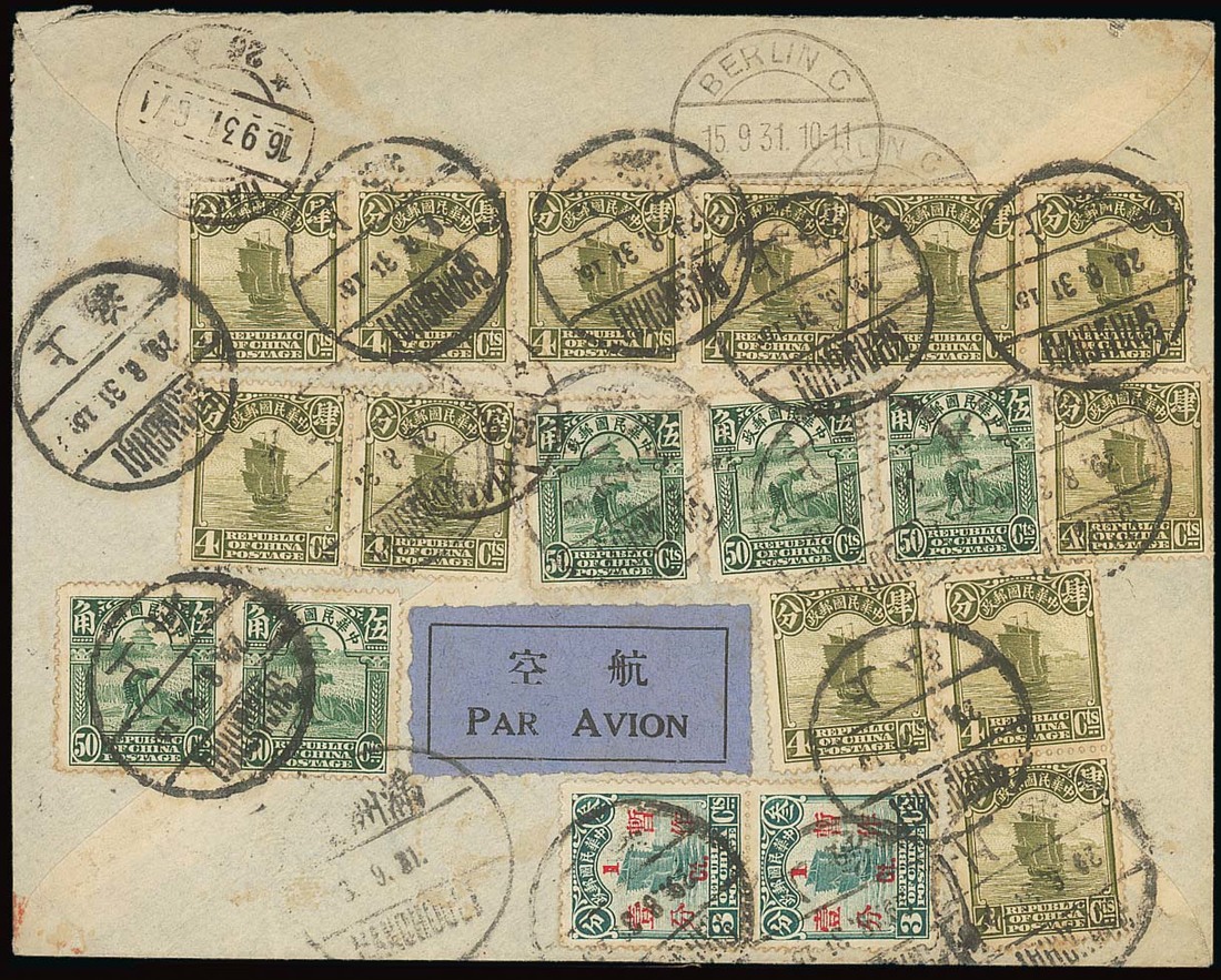 1931 (29 Aug.) commercial envelope registered to Hamburg bearing, on the reverse, $3 franking of nineteen adhesives tied by Shanghai c.d.s. The address side with the blue Par Avion etiquette, Shanghai red on white registration label and route being "Shanghai - Manchuli - Irkoutsk - Moscou - Berlin - Hamburg"; there is a further etiquette on the reverse with Manchouli (3.9), Berlin (15.9) and Hamburg arrival. Minor soiling, a good cover. Photo