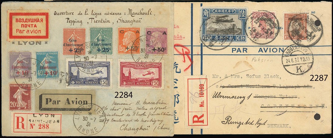 1933 (24 May) first type air mail envelope from the Postal Commissioner, Eastern Szechwan, registered to Denmark "Via Canada" bearing Air Mail 60c. with Szechwan 5c. and $1 tied by Pahsien, Chunking c.d.s. and with red registration label, readdressed on arrival, the reverse with Shanghai, Copenhagen and Rungsted Kyst datestamps; two filing holes at side. Scarce use of the Szechwan provincial issue. Photo
