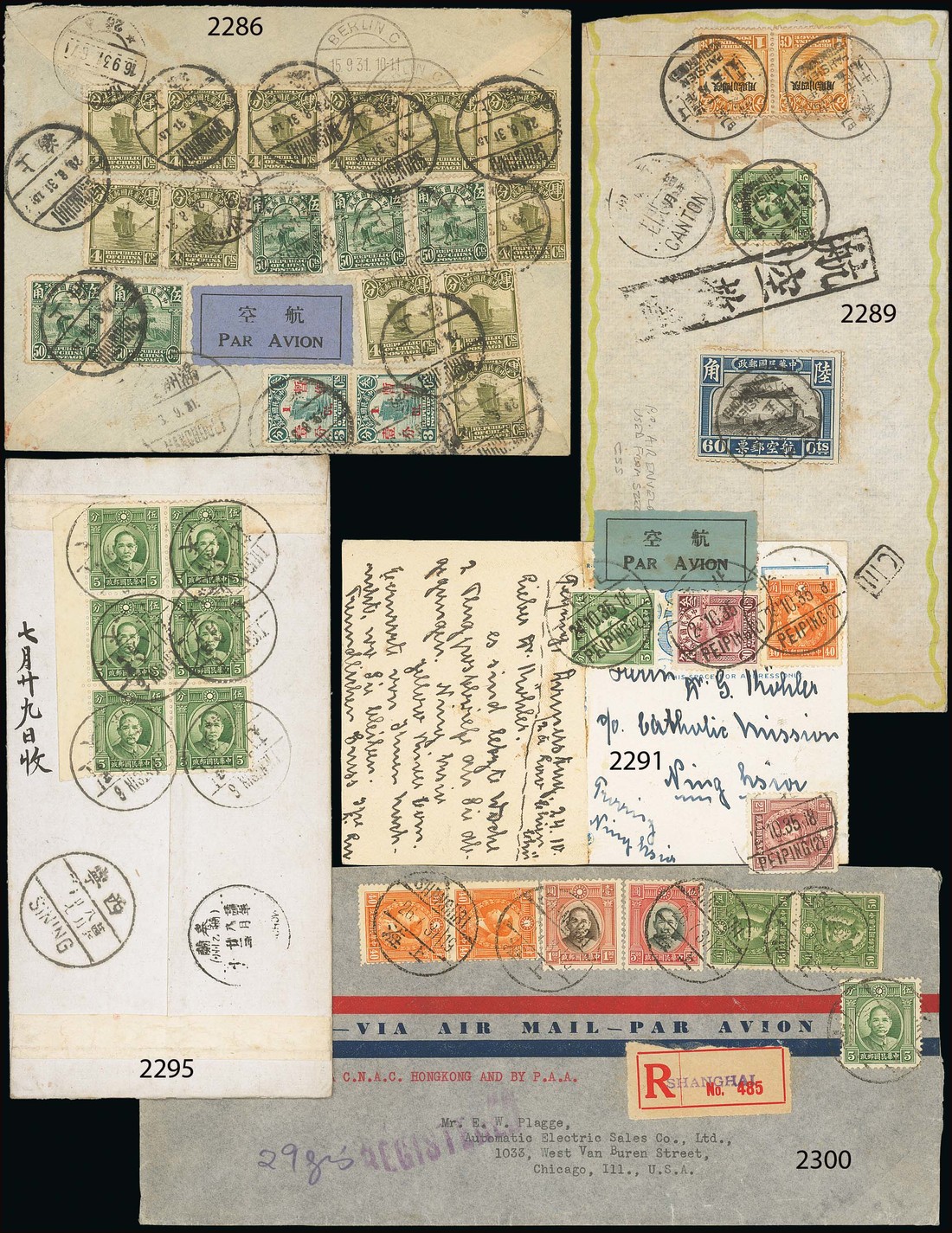 1935 (25 Jan.) second issue air mail envelope sent express to Canton bearing, on the reverse, 1929 Air 60c. with Szechwan Junk 1c. (2) and Sun Yat Sen 5c. tied by Pahsien c.d.s. with boxed air mail handstamp alongside and Canton arrival; the address side with part of the Express Delivery label; good to fine. Photo