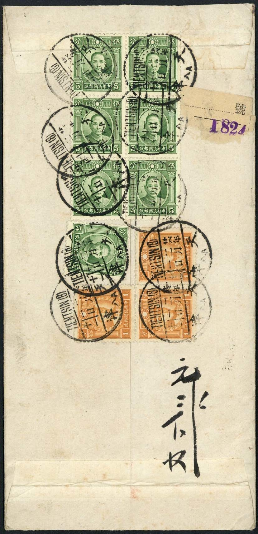 1937 (1 Feb.) domestic cover flown on the Peiping - Ningsia line bearing, on the reverse, 38c. franking tied by Tientsin (8) c.d.s. with part of the registration label, the address side with grey-blue Par Avion etiquette tied by the despatch c.d.s. with further Tientsin, Sining and Lanchow c.d.s.. With original contents, fine