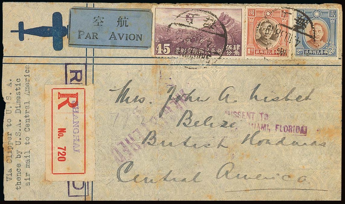 1938 (4 Oct.) air mail envelope registered to British Honduras "Via Clipper to U.S.A. and thence U.S.A. domestic air mail to Central America" bearing $3.45 franking tied by Shanghai c.d.s. with the registration label and Par Avion etiquette alongside, bearing a fair strike of unframed "missent to/miami, florida" in purple, the reverse with Miami, Hawaii and Belize registration c.d.s. (26.10); vertical crease and light soiling. A scarce destination and unusual misdirection. The Sun Yat Sen dollar values with "NCB" perfin of the New York City Bank. Photo