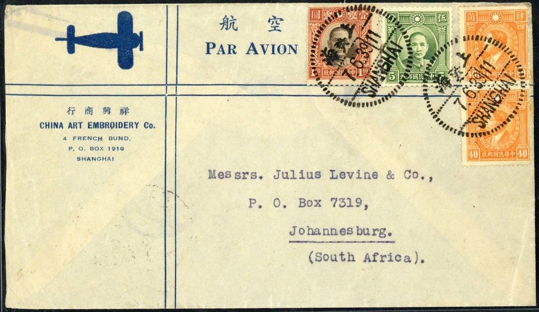 1939 (7 June) commercial air mail envelope to Johannesburg, South Africa bearing $1.85 franking tied by large Shanghai dotted datestamps, Victoria, Hong Kong transit (10.6) on the reverse. Fine and a scarce destination