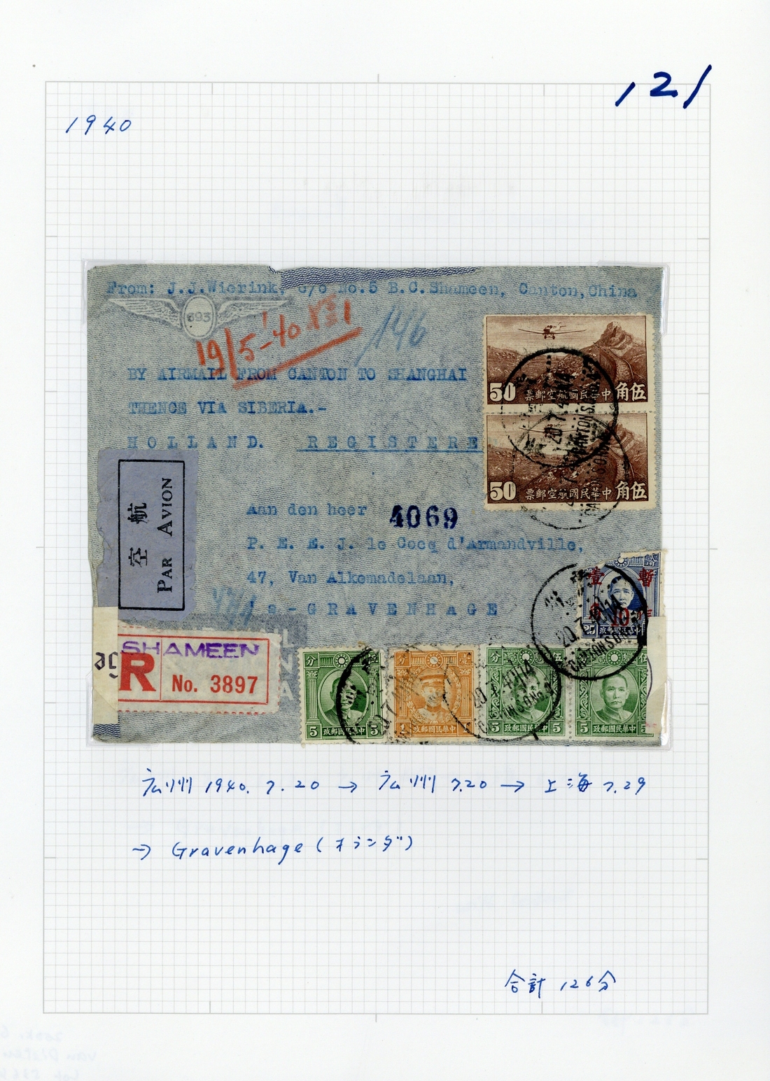 1940 a group of flown covers to Netherlands or Germany, routed via Siberia, with registered from Shameen (3) with German censor seals; from Hankow to Germany and picture post card from Canton to Austria with Par Avion etiquette and German censor handstamp. Scarce usage. (5 covers)