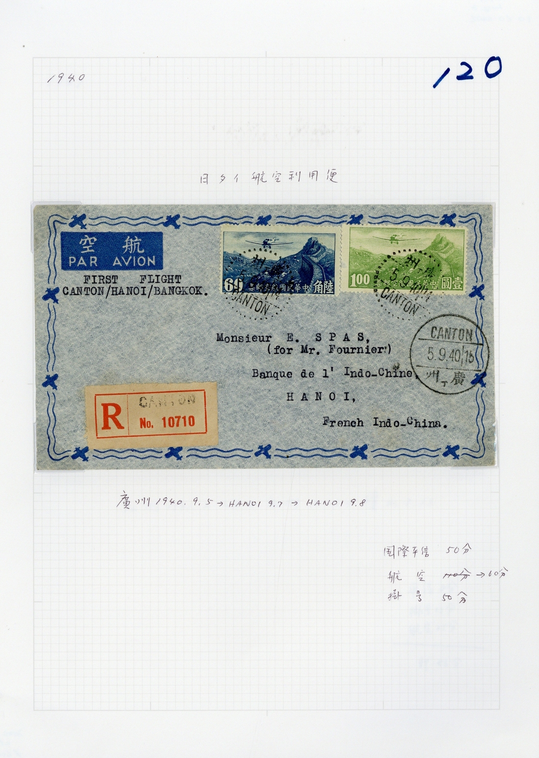 1940-41 three Chun-Hwa First flight covers with 1940 (5 Sept.) Canton - Hanoi, registered; 1940 (18 Apr.) Canton - Tokyo; 1941 (13 Mar.) Canton - Hoihow with part registration label. Good to fine. (3 covers)