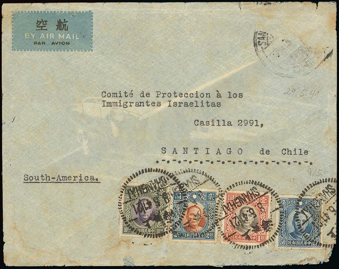 1941 (8 May) air mail envelope to Santiago, Chile, bearing $13.50 franking tied by Shanghai despatch c.d.s. plus part strikes of Santiago arrival c.d.s. (29.5). A scarce destination and rate. Photo