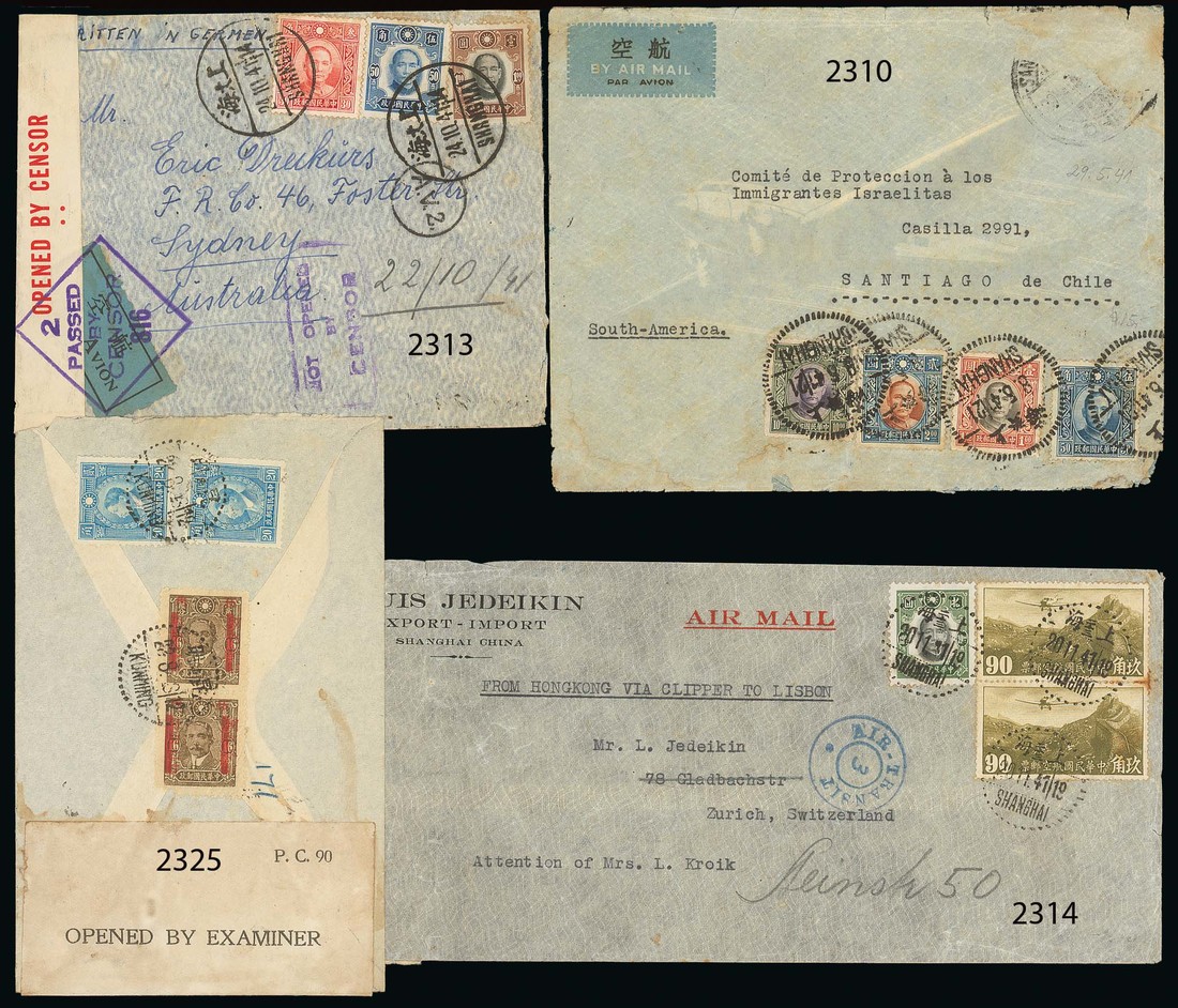 1941 (24 Oct.) air mail envelope to Australia bearing Sun Yat Sen 30c., 50c. and $1 tied by Shanghai c.d.s. with a good strike of the scarce, circular "A.V.2." alongside, via Hong Kong with boxed "not opened/by/censor" and Victoria backstamp (28.12), Australian censor seal at left, partly covering the air mail etiquette and tied by diamond "2/passed/by/censor/816"; a few small age marks. Photo
